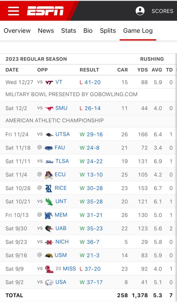 Makhi shredded our rivals by putting up 100 yards on every American Conference regular season foe except for FAU. He bullied his way through the league and won American conference Rookie of the Year in addition to being named first team all conference. Vision and change of direction were his calling cards last year as well as a hunger to get yards after first contact. In his own words, “see the hole and hit it”.