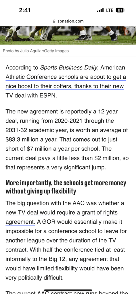 As I told you before, it is all about the dollars so let’s talk about the dollars. An AAC media deal was struck in 2020 for 12 years at roughly $7 million per school. I have read this has gone as high as $9 but when signed it was $7. Source below.