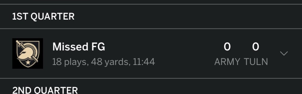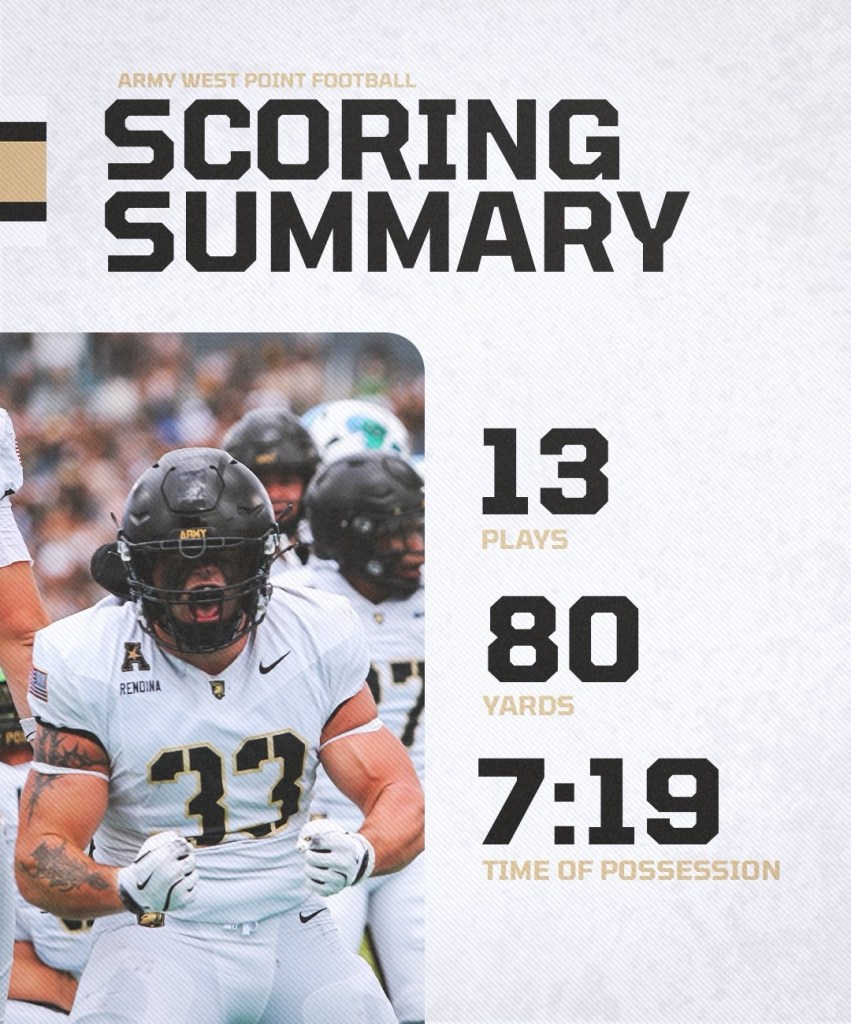 As you know, I like to do drive by drive recaps. Army makes this easy on me by playing games with about 5 total drives across 4 quarters . The black knights run the ball for 2 to 3 yards 4 times in a row all the way down the field. It’s absolutely maddening to watch.